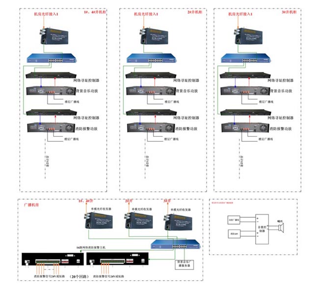 泰州碧桂園五星級(jí)大酒店位于江蘇省泰州市海陵區(qū)泰東河大橋北側(cè),地處生態(tài)旅游區(qū)。本次廣播設(shè)計(jì)安裝全金屬音箱1265只,按照功能分為40個(gè)區(qū)域,每個(gè)區(qū)域同時(shí)播放不同背景音樂;設(shè)置中心主控機(jī)房一個(gè),分中心機(jī)房4個(gè);廣播系統(tǒng)與酒店消防報(bào)警系統(tǒng)聯(lián)動(dòng)實(shí)現(xiàn)N-3、N-2、N-1、N、N+1、N+2、N+3報(bào)警。